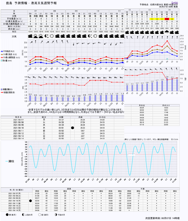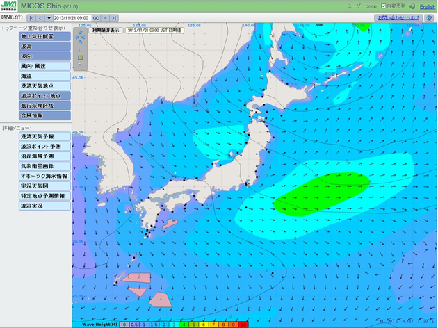 - 船舶の運航、港湾作業等、効率的な安全管理を支援する気象海象情報サービス。港湾天気予報は、日本全国約300港を対象とし、短期(3日先まで)と週間(7日先まで)の天気、波高、風向風速予測情報を提供。海岸工事等で利用するための特定地点予測情報や、日本近海の任意ポイントの波浪予測といった独自予測情報のほか、最新の台風情報、波浪実況、海流、衛星画像なども閲覧可能