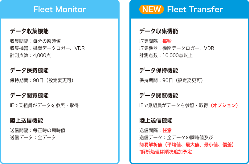 ホーム運航運航システム遠隔監視 「カテゴリ:遠隔監視」 Fleet Transfer Fleet Transfer 2024年5月17日2024年5月24日 サービス概要 サービス名 Fleet Transfer サービス読み方 フリートトランスファー サービスURL https://www.tsuneishi.co.jp/mes-s/business/dx-monitoring/monitoring.html サービス提供団体 三井E&S造船株式会社 カテゴリ #遠隔監視 サービス概要 船舶の非常に詳細なデータを収集し、陸上に送信することで、陸上側での就航解析等のサービスに活用可能なシステム 導入実績 180隻 料金プラン n/a 備考 n/a