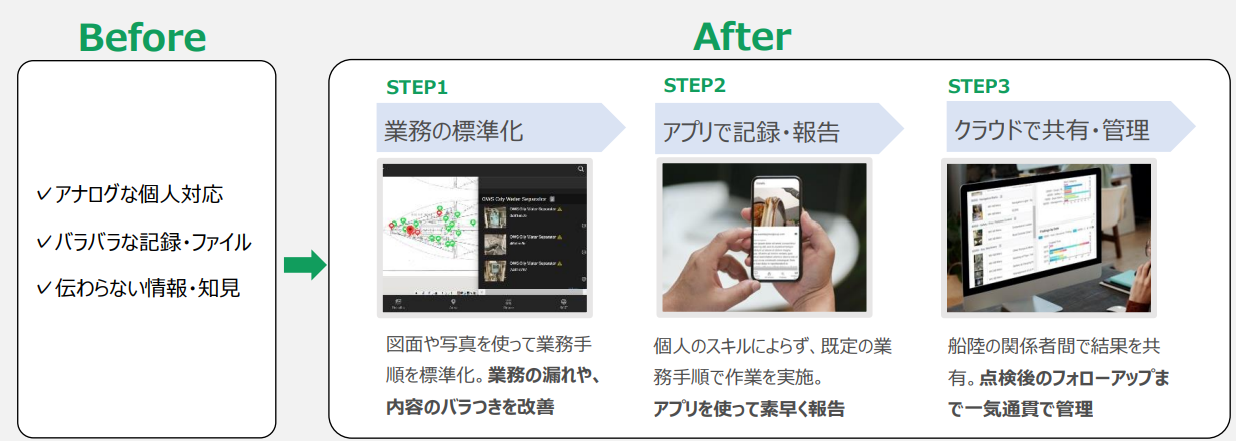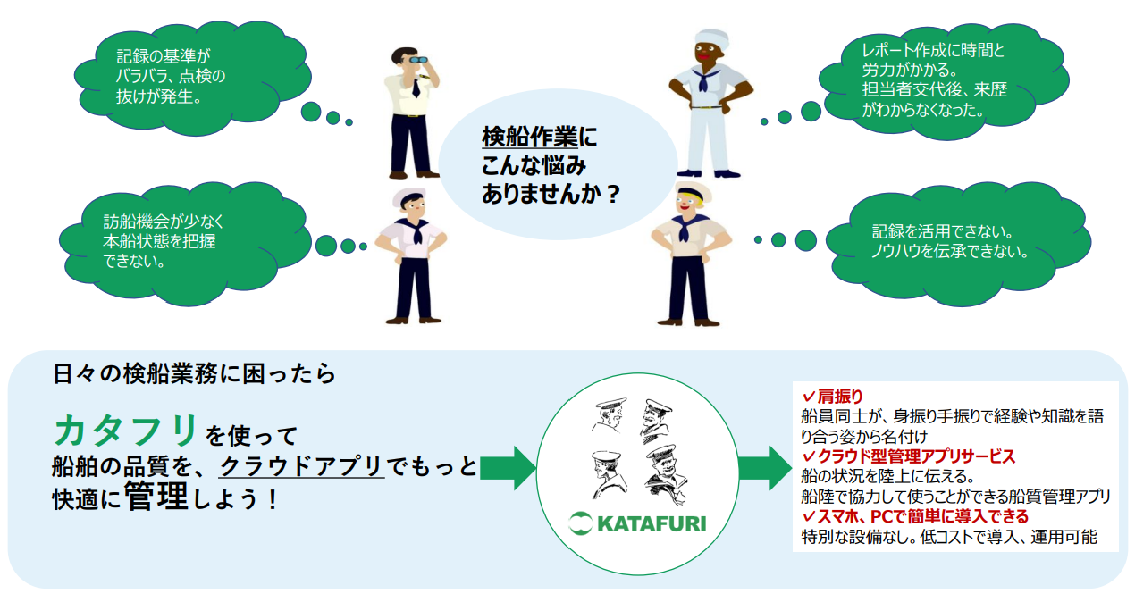 ホーム運航運航システム遠隔監視 「カテゴリ:遠隔監視」 カタフリアプリ カタフリアプリ 2024年4月1日2024年4月5日 サービス概要 サービス名 カタフリアプリ サービス読み方 カタフリアプリ サービスURL https://www.motech.co.jp/business/ict/ サービス提供団体 商船三井テクノトレード株式会社 カテゴリ #遠隔監視 サービス概要 経験の浅い担当者でも基準に添った点検記録をスマホアプリで簡単に作成でき、陸上の管理者とクラウド上で情報を共有できる、船舶の品質管理プラットフォーム 導入実績 n/a 料金プラン n/a 備考 n/a