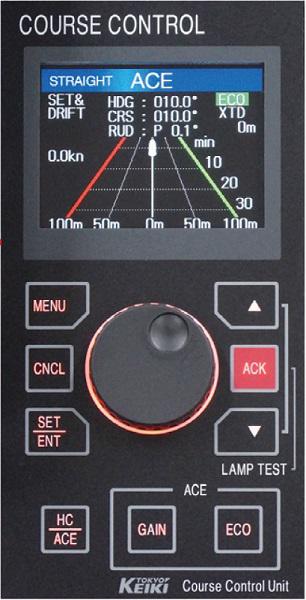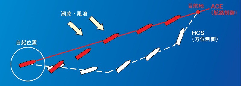 - 現地点から目的地までの方位を設定することで、目的地に向かう航路を自動的に作成し、外乱(潮流)の推定や航路離脱距離を計算して、最適に舵を制御し、航路上を航行することが可能